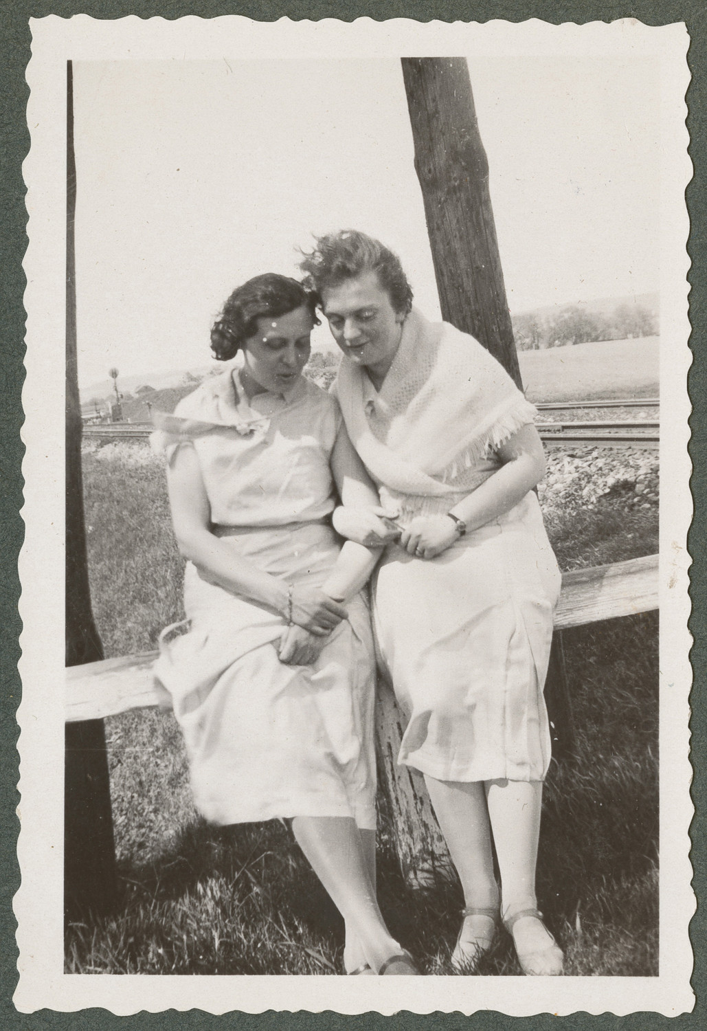 Nazwa: Dwie kobiety siedzące na rampie, portret w plenerze, data: 16.05.1932, miejsce: , typ obiektu: , wymiary8,8 x 6,0, opis: Kobiety (Helena Homolacs, Zofia Mussilowa), 40-45 lat, siedzące na belce ogrodzenia. Ujęcie w całej postaci, zwrócone ku sobie 3/4. Głowy blisko siebie, jasne sukienki, włosy w fale. W tle las iglasty i zamglone pola.