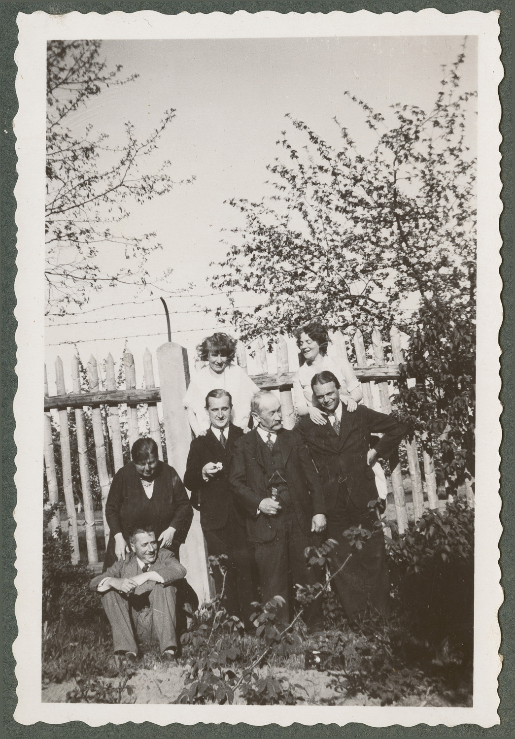 Nazwa: Sześć osób w ogrodzie, portret w plenerze, Rudawa, data: 16.05.1932, miejsce: , typ obiektu: , wymiary8,8 x 6,0, opis: Trzy kobiety, ok. 40 lat, (siostry Kosińskie) i trzej mężczyźni w średnim wieku: Mussilowie Karyłowscy i NN. Siedzą lub stoją przed sztachetowym płotem. Całe postacie, stroje spacerowe, słoneczny dzień, maj por. serię fot. (czas Zielonych Świąt).