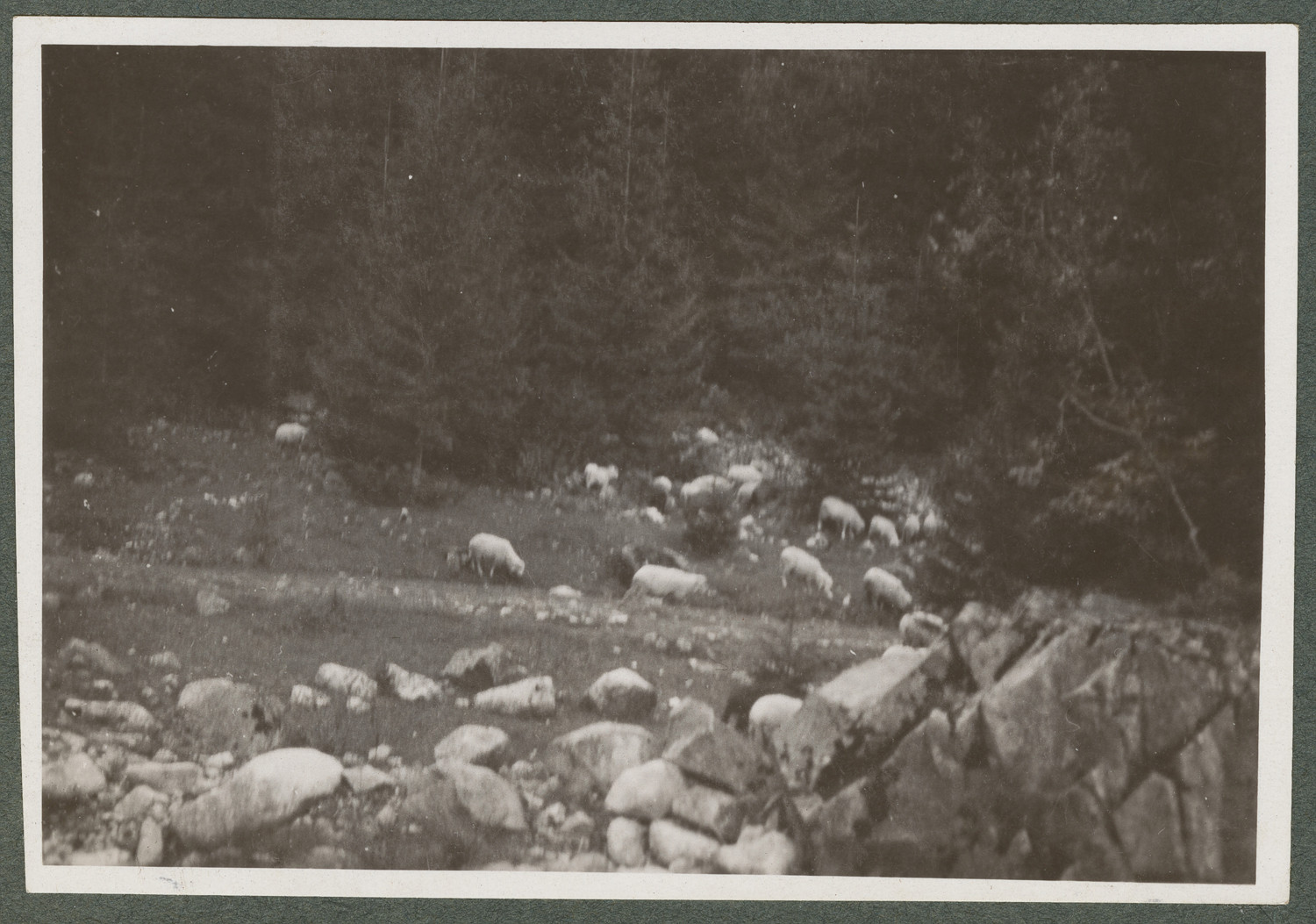 Nazwa: Tatry, pejzaż górski, data: 25.08.1932, miejsce: , typ obiektu: , wymiary8,8 x 6,0, opis: Na pierwszym planie skały i kamienie; ścieżka; na zboczu kilka białych owiec oraz pies owczarek. W tle las iglasty, głównie świerkowy.