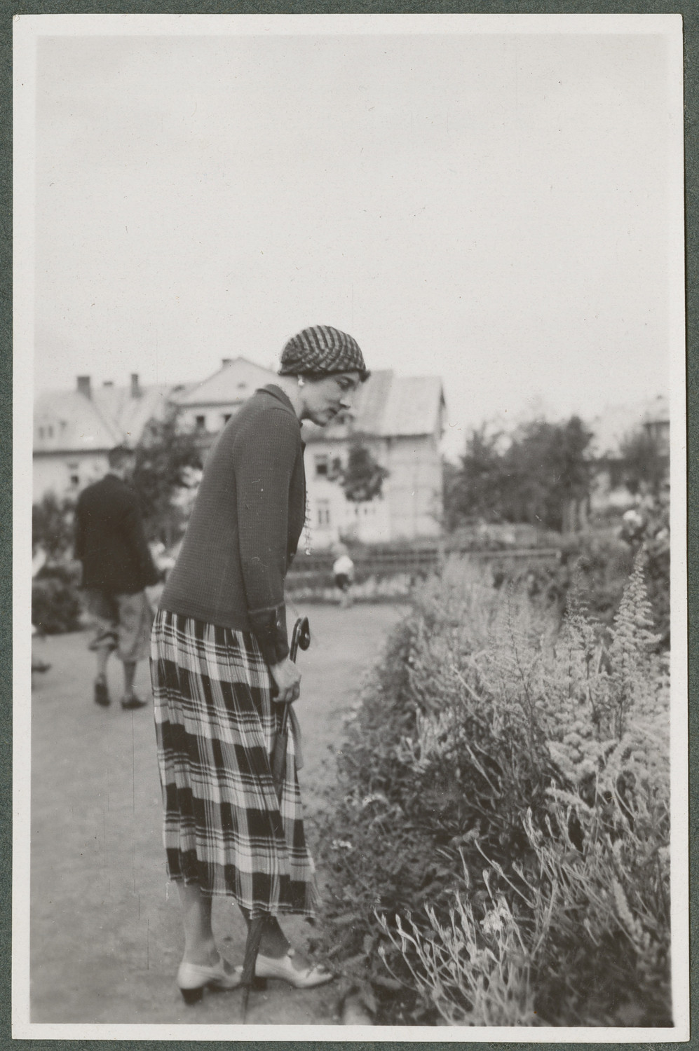 Nazwa: Wanda Korytowska, portret w plenerze, data: lato 1932, miejsce: , typ obiektu: , wymiary8,8 x 6,0, opis: Kobieta (40-50 lat), stojąca na alei profilem w prawo. Pochylona nad rabatą wysokich roślin; ujęcie w 3/4. Ubrana w ciemny sweter, spódnicę w kratę, nakrycie głowy, białe buty z paskiem. Tło: jasne dwupiętrowe budynki, z lewej przechodzień w pumpach.