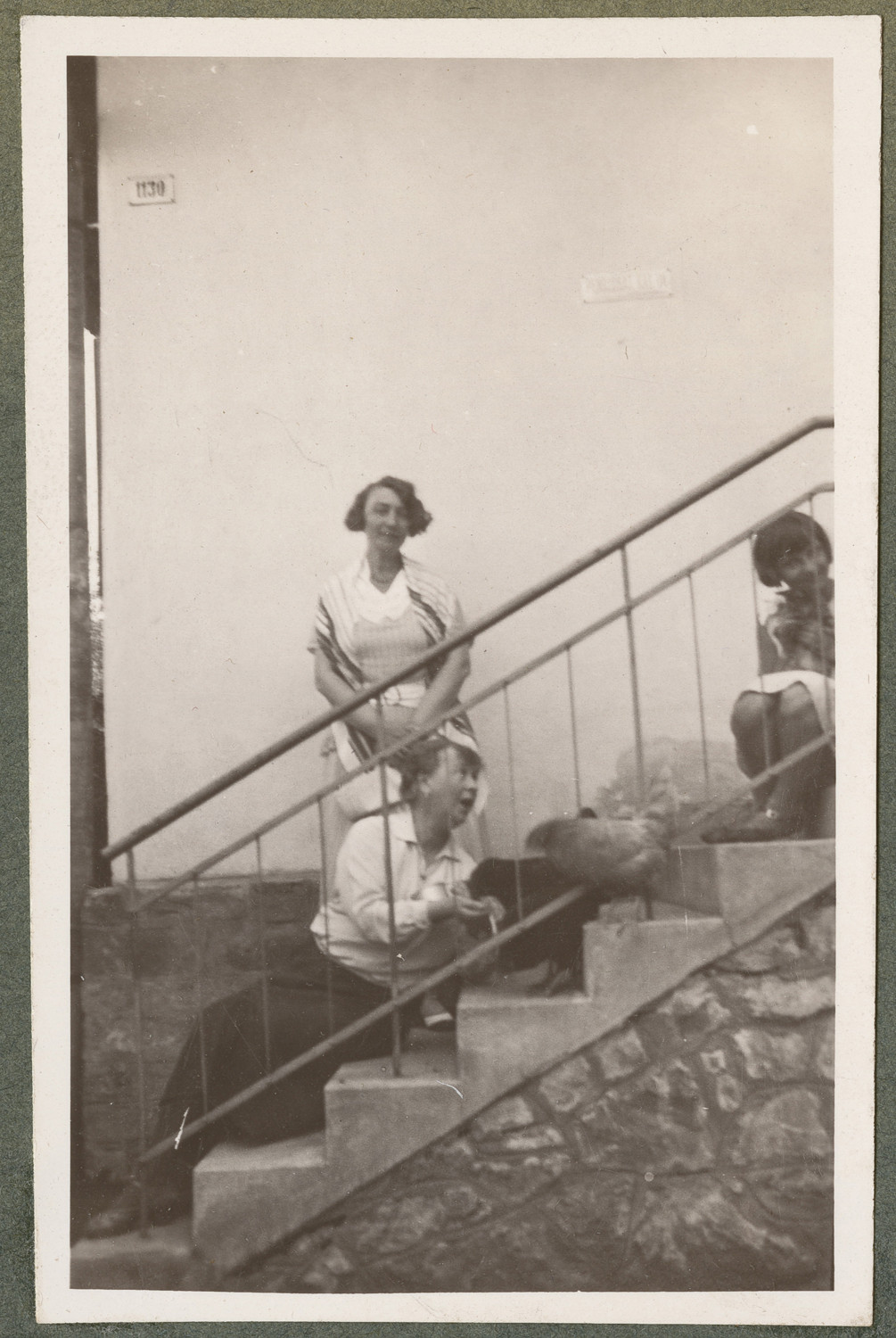 Nazwa: Trzy kobiety siedzące na schodach pod domem, portret, data: 30.08.1932, miejsce: , typ obiektu: , wymiary8,8 x 5,6, opis: Kobiety (m. in. Jadwiga Podwin), 20-30 lat, siedzące na schodkach pod białą ścianą domu o metalowej balustradzie, ujęcie całej postaci, z prawej kobieta częściowo poza kadrem; 2 kury (słabo widoczne).