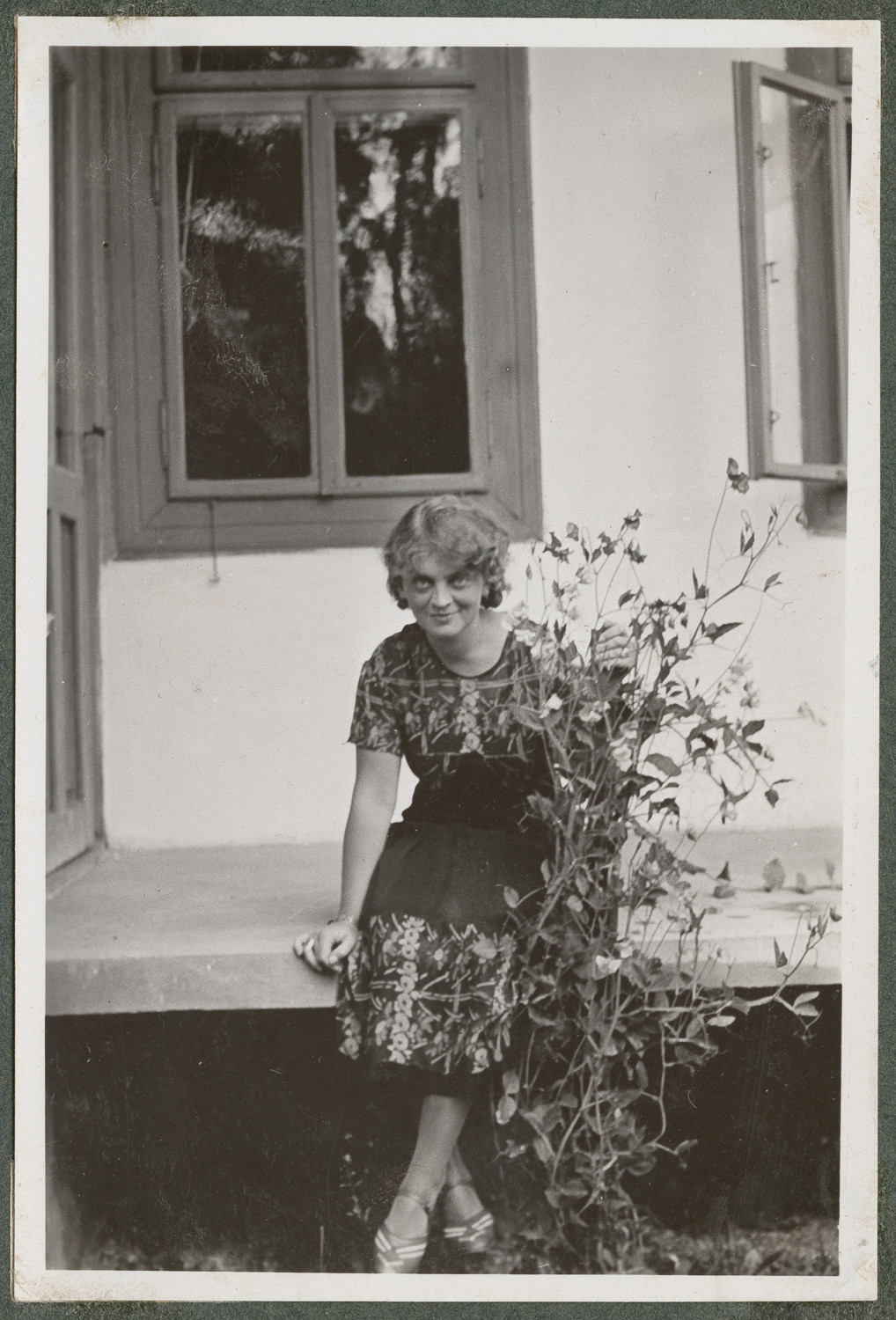 Nazwa: Zofia Mussilowa, portret przed domem, data: 28.08.1932, miejsce: , typ obiektu: , wymiary8,8 x 6,0, opis: Kobieta (40-45 lat) siedząca na kamiennej ławie, pod białą ścianą piętrowego domu. W tle zamknięte okno, ujęcie całej postaci, głowa lekko w lewo, uśmiech. Wzorzysta sukienka i buty z epoki, krótkie włosy w fale. Kobieta jest upozowana za krzakiem.