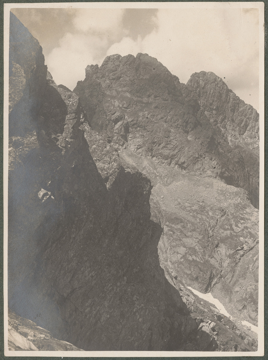 Nazwa: Skaliste szczyty w Tatrach, krajobraz górski, data: lipiec 1932, miejsce: , typ obiektu: , wymiary11,5 x 8,5, opis: Pasma górskie, kulisowo, po lewej strome zbocze w cieniu. Silny efekt światłocienia. W żlebie drobny ślad śniegu (lipiec), w tle skały w słońcu; białe chmury.