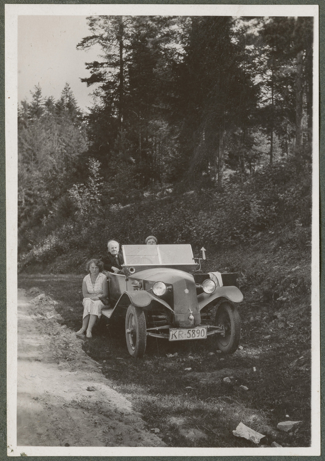 Nazwa: Trzy kobiety przy samochodzie, portret w plenerze, data: 14.08.1932, miejsce: , typ obiektu: , wymiary8,8 x 6,0, opis: 2 kobiety, siostry, (ok. 40 lat) z matką (70 lat) - Zofia, Helena oraz Maria Kosińskie. Są upozowane przy samochodzie Tatra widocznym od przodu. W tle widoczny las iglasty i droga.
