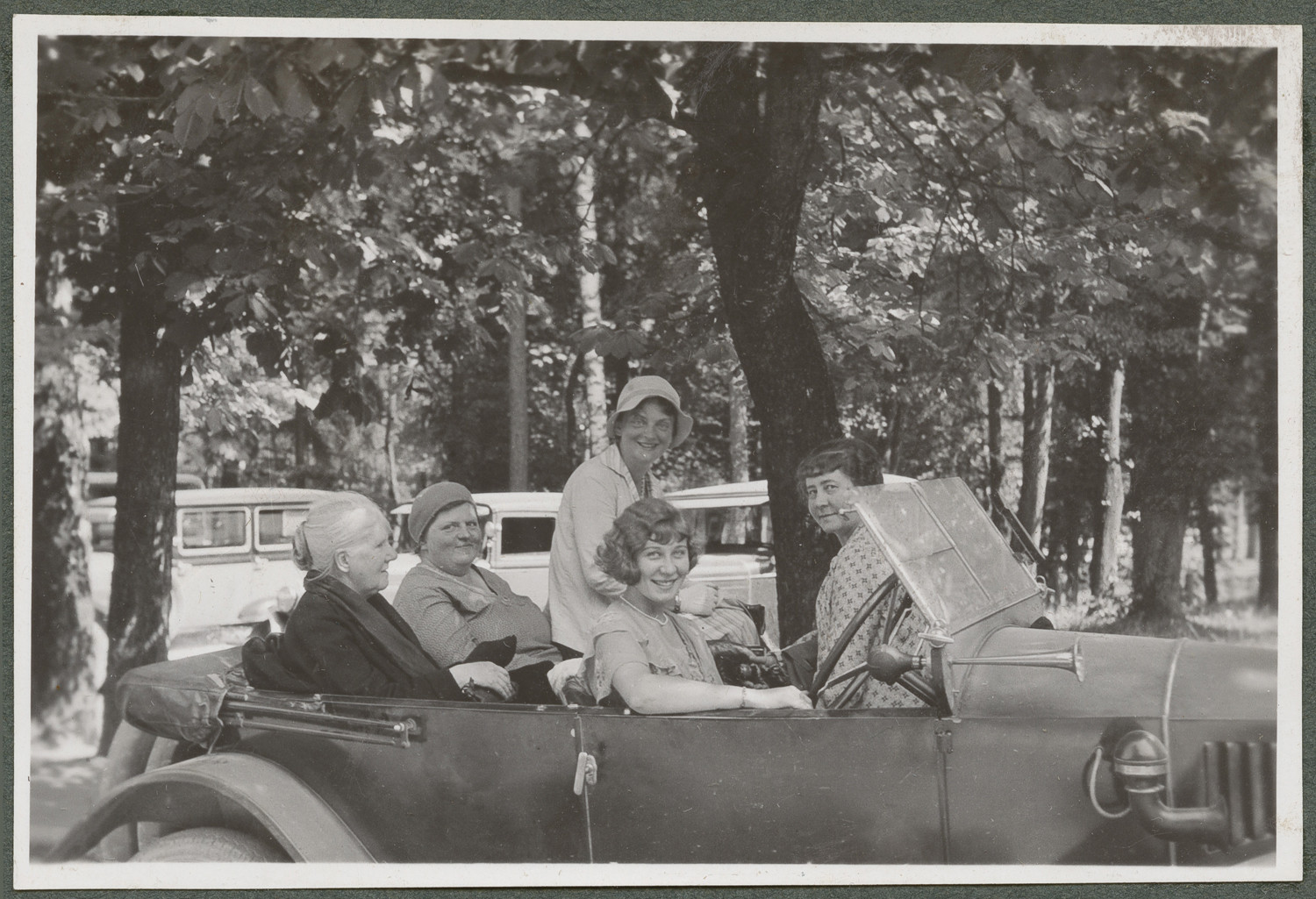 Nazwa: Grupa kobiet w samochodzie, portret zbiorowy, data: 14.08.1932, miejsce: , typ obiektu: , wymiary8,8 x 6,0, opis: Grupa 5 kobiet (20-70 lat), siedzących w odkrytym samochodzie Tatra. Pojazd stoi zwrócony w lewo, portretowane pozują do fotografa na tle drzewa i 2 innych samochodów.