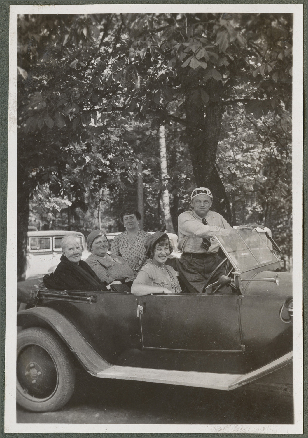 Nazwa: Grupa osób w samochodzie, portret zbiorowy w plenerze, data: 14.08.1932, miejsce: , typ obiektu: , wymiary8,8 x 6,0, opis: 4 uśmiechnięte kobiety (20-70 lat) siedzą w odkrytym samochodzie osobowym. Paweł Mussil (ok. 40 lat), przy kierownicy, w spodniach, koszuli, krawacie i goglach na czole. W tle ulica, inne samochody, drzewa - kasztanowce. Rabka.