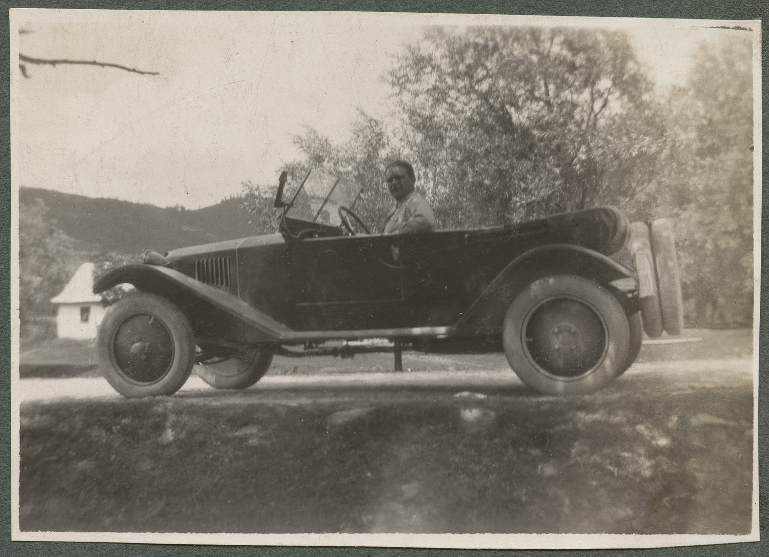 Nazwa: Paweł Mussil w samochodzie, portret w plenerze, data: 16.07.1932, miejsce: , typ obiektu: , wymiary8,8 x 6,0, opis: Mężczyzna (30-40 lat) siedzący za kierownicą odkrytego samochodu osobowego Tatra. Widoczna droga gruntowa i drzewa liściaste. Fotografia wykonana w słońcu, latem. Po lewej pasmo gór i prawdopodobnie bielona kapliczka lub budynek. Rytro.