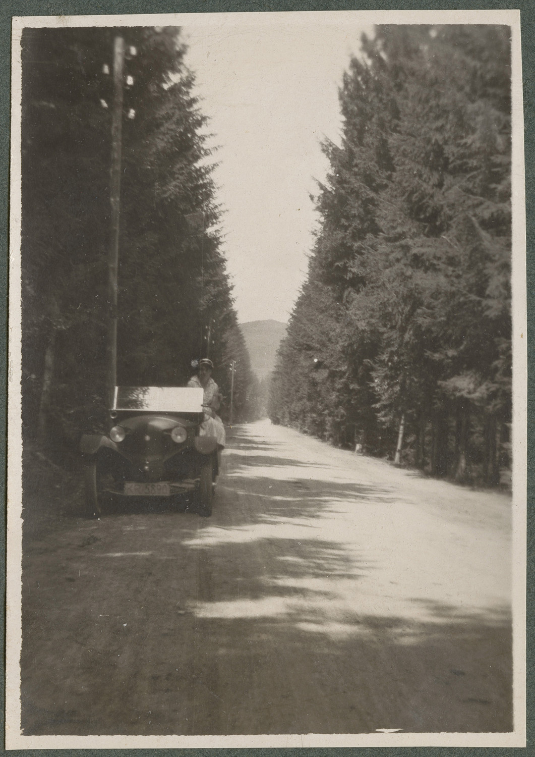 Nazwa: Zofia Mussilowa w samochodzie, portret w plenerze, data: 16.07.1932, miejsce: , typ obiektu: , wymiary8,8 x 6,0, opis: Zofia Mussilowa (30-40 lat), siedząca na karoserii samochodu osobowego (Tatra). Ubrana w jasną sukienkę i kapelusz. W tle las iglasty, droga zacieniona. Słoneczny dzień lata. Po lewej słup telegraficzny, w dali pośrodku zamglone pasmo gór.