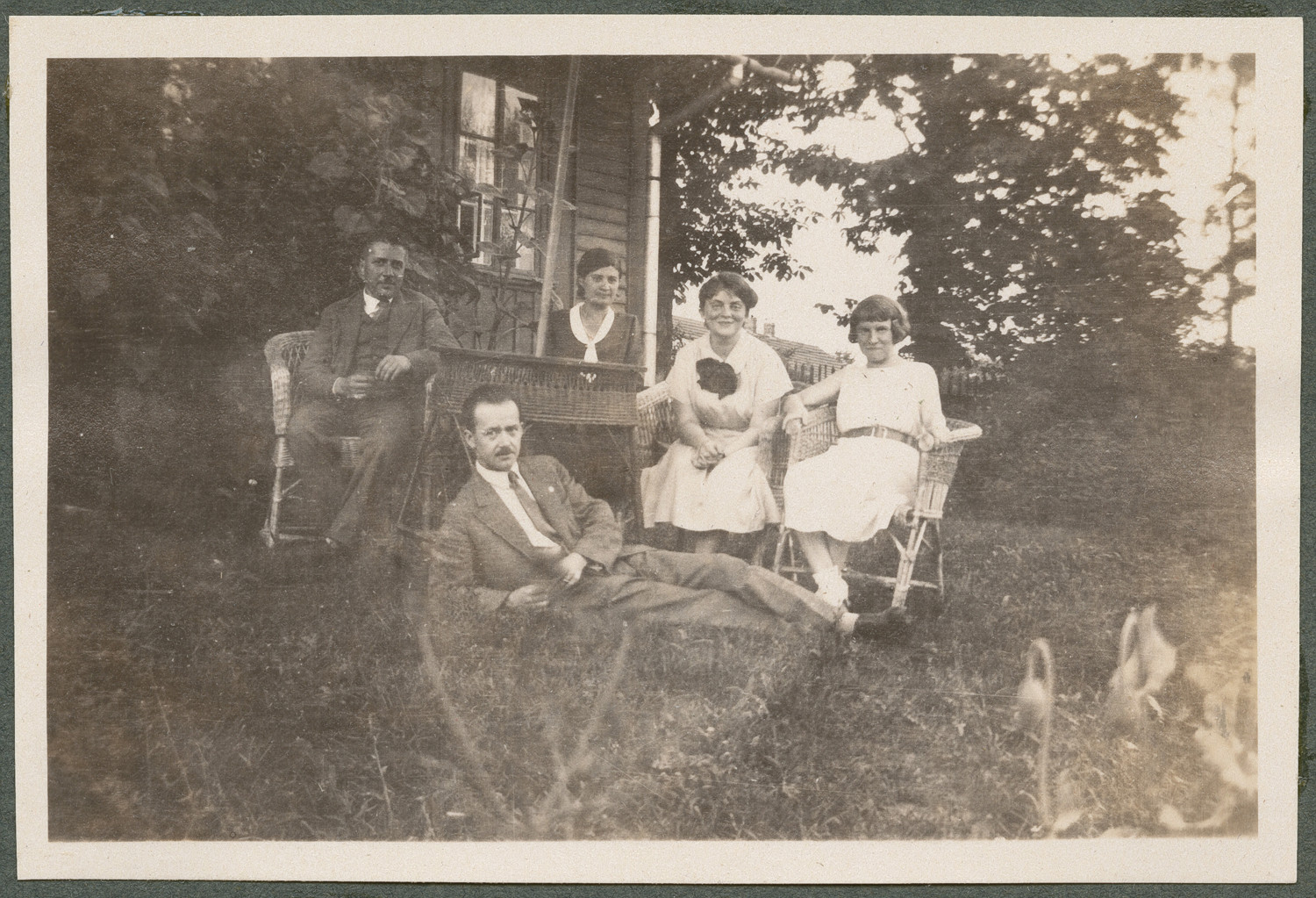 Nazwa: Grupa przyjaciół, portret zbiorowy w plenerze, data: 05.07.1932, miejsce: , typ obiektu: , wymiary8,8 x 6,0, opis: 3 kobiety i 2 mężczyzn (30-40 lat) siedzą w fotelach wiklinowych. Mężczyzna na pierwszym planie wpółleży. Scena przed drewnianym domem. Ubrani w stroje wizytowe, letnie, z epoki. W ogrodzie kwiaty i drzewa liściaste. Karyłowscy i Mussilowie.