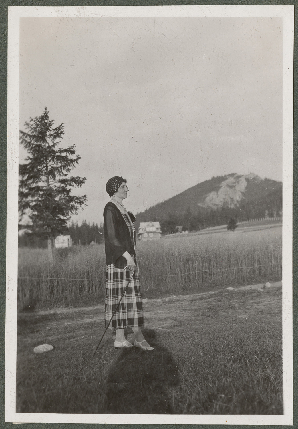 Nazwa: Wanda Korytowska, portret w plenerze, data: 23.08.1932, miejsce: , typ obiektu: , wymiary8,8 x 6,0, opis: Kobieta (40-50 lat), stojąca na drodze. Ujęta cała postać, prawy profil. Ubrana w kraciastą spódnicę i sweter/żakiet. Falowane włosy, ażurowe nakrycie głowy. W ręce ma laskę spacerową. Na pierwszym planie cień fotografa. W tle pejzaż wiejsko-górski.