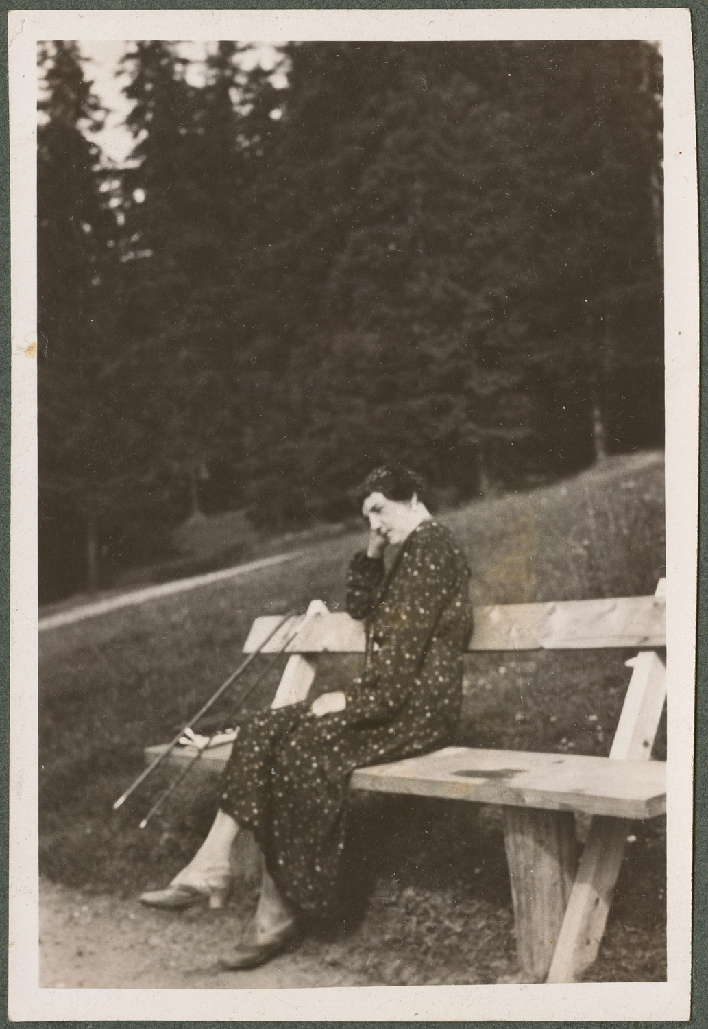 Nazwa: Wanda Korytowska, portret w plenerze, data: 30.08.1932, miejsce: , typ obiektu: , wymiary9,0 x 6,0, opis: Kobieta (40-50 lat), siedząca na drewnianej ławce. Ujęcie całej postaci, profil, głowa pochylona oparta na prawej dłoni. Włosy w fale, wzorzysta suknia. W tle gęsty las iglasty i pochyła łąka;. Na oparciu ławki zaczepione 2 laski spacerowe.