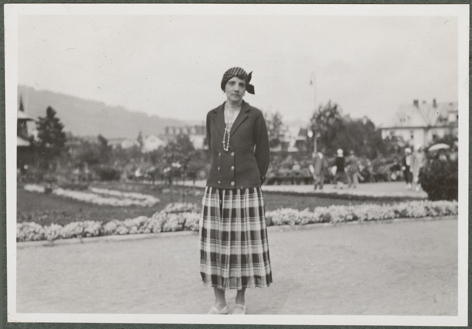 Nazwa: Wanda Korytowska, portret w plenerze, data: 31.08.1932, miejsce: , typ obiektu: , wymiary8,8 x 6,0, opis: Kobieta (45 l.) stojąca na alei parkowej. Ujęcie prawie całej postaci, en face. Ręce założone do tyłu. Ciemny, dwurzędowy żakiet, sznur korali, białe buty z paskiem, nakrycie głowy. W tle słabo widoczne postacie przechodniów, wille, rabaty. Zakopane.