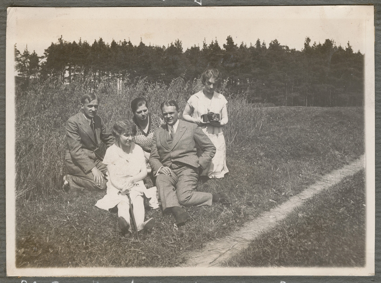 Nazwa: Pięć osób na trawie, portret w plenerze, data: 25.08.1929, miejsce: , typ obiektu: , wymiary8,5 x 11,5, opis: Trzy kobiety ok. 30. l. (siostry Kosińskie), Paweł Mussil i Czarnecki, siedzący na trawie przy ścieżce polnej, na tle lasu iglastego. Stroje spacerowe letnie, Zofia trzyma aparat fotograficzny. Ujęcie całych postaci, w tle pejzaż.