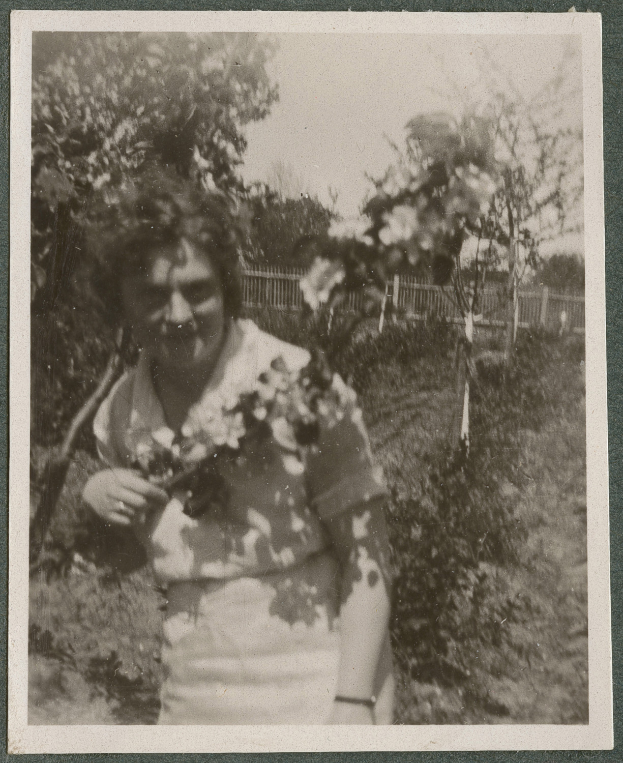 Nazwa: Zofia Mussilowa w ogrodzie, portret w plenerze, data: 16.05.1932, miejsce: , typ obiektu: , wymiary5,3 x 4,3, opis: Kobieta (40 l.) stojąca w ogrodzie, sadzie. Ujęcie 3/4, lekko pochylona - fotografia wykonana nieco z góry. Jest uśmiechnięta. Ubrana w jasną, letnią sukienkę. Falowane włosy w nieładzie. Trzyma gałąź kwitnącego drzewa. Miejscowość Rudawa.