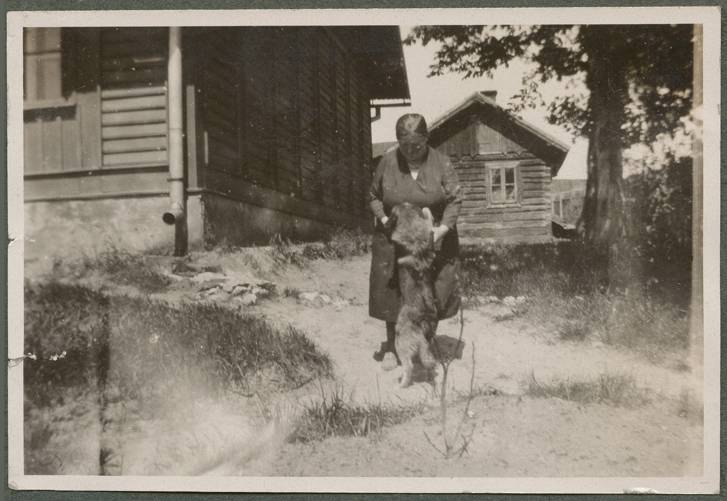 Nazwa: Helena Kosińska i pies Reksio na podwórzu, scena w plenerze, data: 16.05.1932, miejsce: , typ obiektu: , wymiary8,5 x 6,0, opis: Kobieta (ok. 40 l.), w ciemnym ubraniu i spiętych włosach, stoi przed szalowanym domem. Trzyma za łapy wspiętego na tylnych łapach podwórzowego psa. W tle drzewo i drewniane domy.