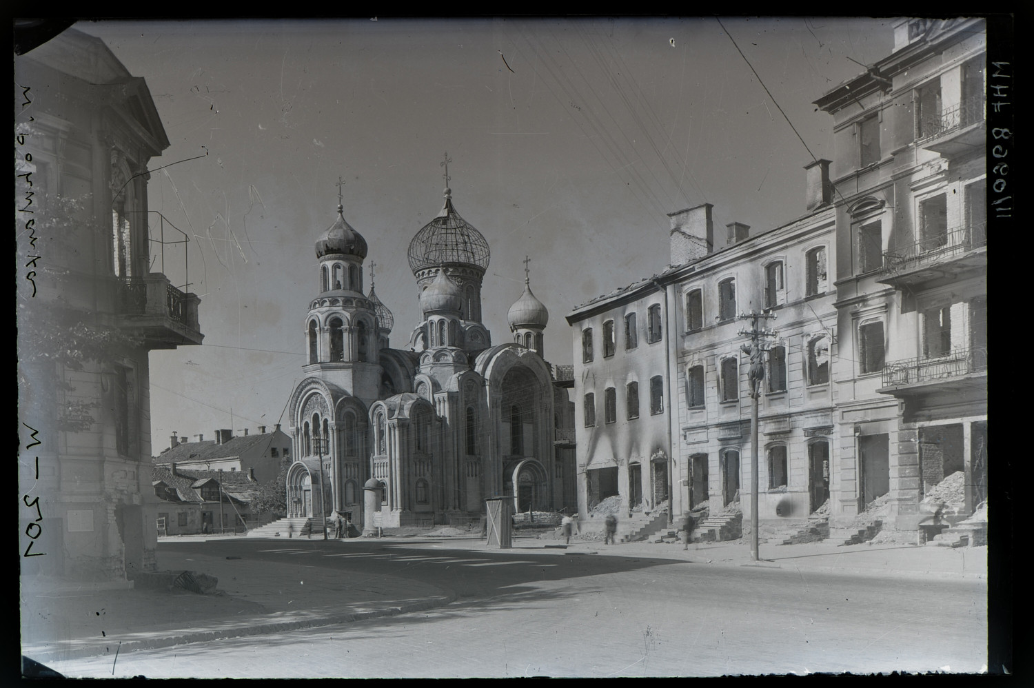 Nazwa: Wilno, ulica Pohulanka., data: 1944, miejsce: , typ obiektu: , wymiary9,9 x 14,9, opis: Cerkiew Romanowska przy ulicy Pohulanka.